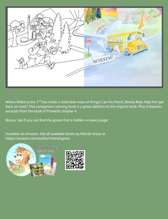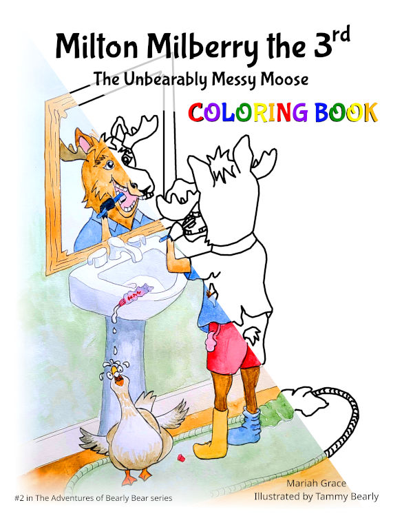 Description: Cozy up with this new coloring book from Mariah Grace. It goes along with the children’s book, Milton Milberry the 3rd The Unbearably Messy Moose. This coloring book features verses from Proverbs 4. Bonus: see if you can find the goose that is hidden on every page!